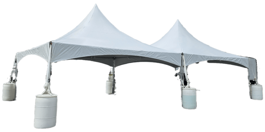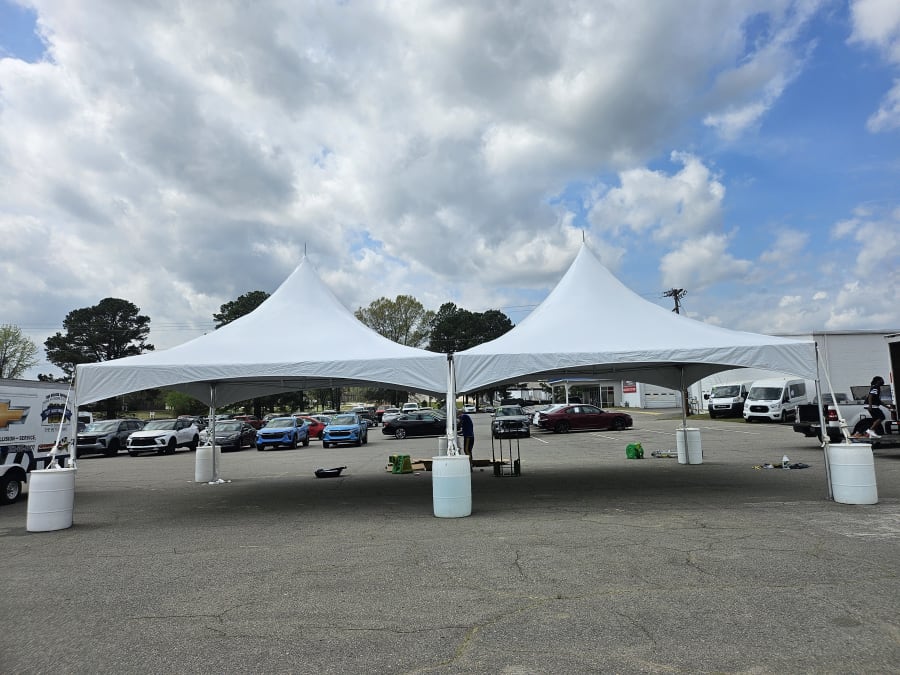 Stay dry with our 20'x40' high peak commercial tent setup and let the fun continue no matter the weather. Rain or sunshine, the party must go on and Bounce Town is here to help. This tent setup includes setup and breakdown by our team of professionals along with all straps, tie-downs, and stakes for use on any grass surfaces. We can also setup on hard surfaces as seen in the pictures and can provide ready-to-go water barrels at a small additional fee of $18/barrel. They are 360lbs each and our price includes transport, water, and setup. This tent requires a minimum of 6 barrels. Call our office at 252-557-3014 to add this to your reservation if your event is to be on a hard surface. Walls for your tent are also available upon request. Contact us for additional information.....