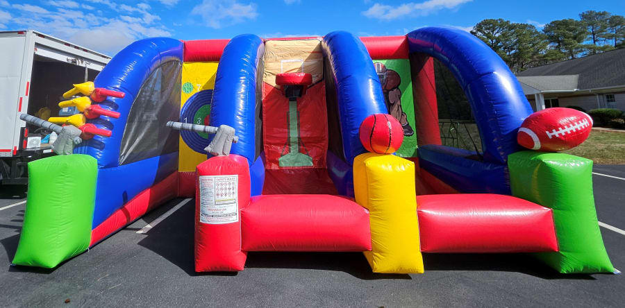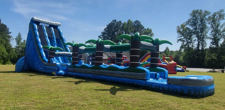 ðĶA HUGE 28ft Waterslide, Obstacle Course, Dunk booth, Multi Game Inflatable and Jousting to battle it out among 4 of your friends family all at once. And with a top notch speaker package, commercial tents, chairs & tables for 36 people and your own personal cotton candy and popcorn machines with 2 of your very own Bounce Town operators, you're ready for the ultimate Family Fun Day event!